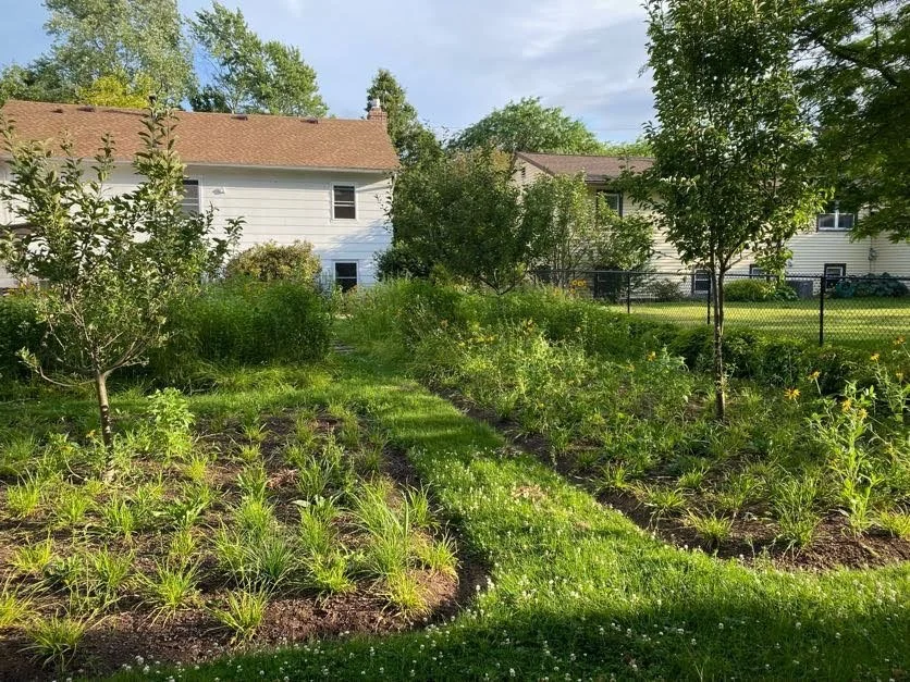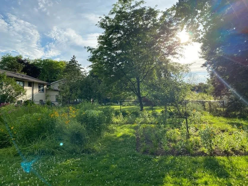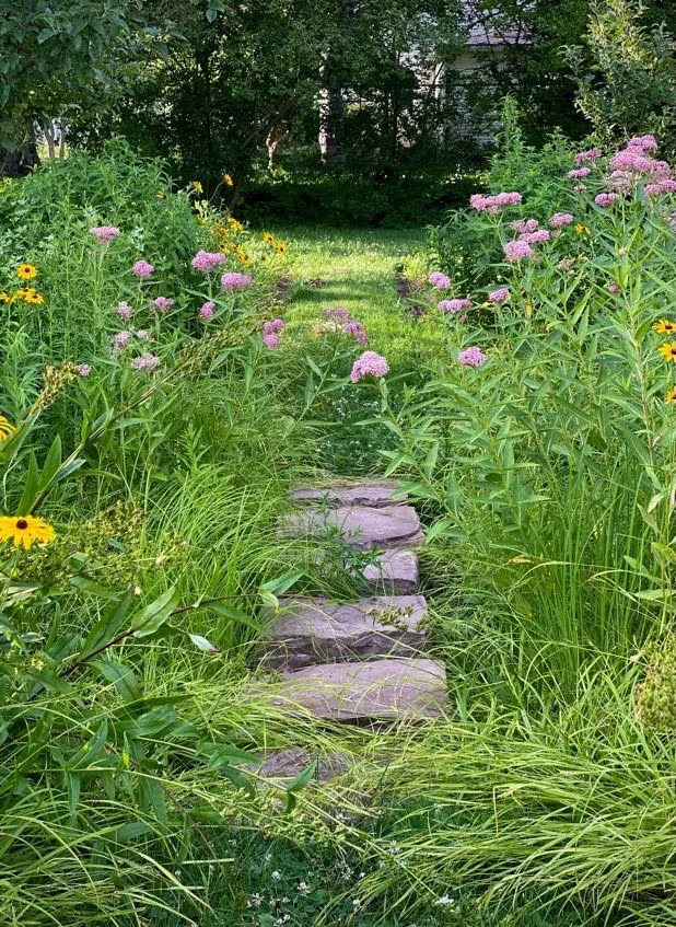 A desire for less lawn and the creation of a beautiful mini meadow was the prompt for this project. Installed over several years - the plan features a shallow swale with medina sandstone stepping stones planted with moisture loving perennials such as Hardy Hibiscus, Swamp Milkweed, and Cardinal Flower. Four apple trees anchor the meadow area and are accented by drifts of Tufted Hairgrass, Foxglove Beardtongue, Beebalm, and Dense Blazingstar. The new gardens are frequently visited by native bees, butterflies and are a home to a nest of baby bunnies.